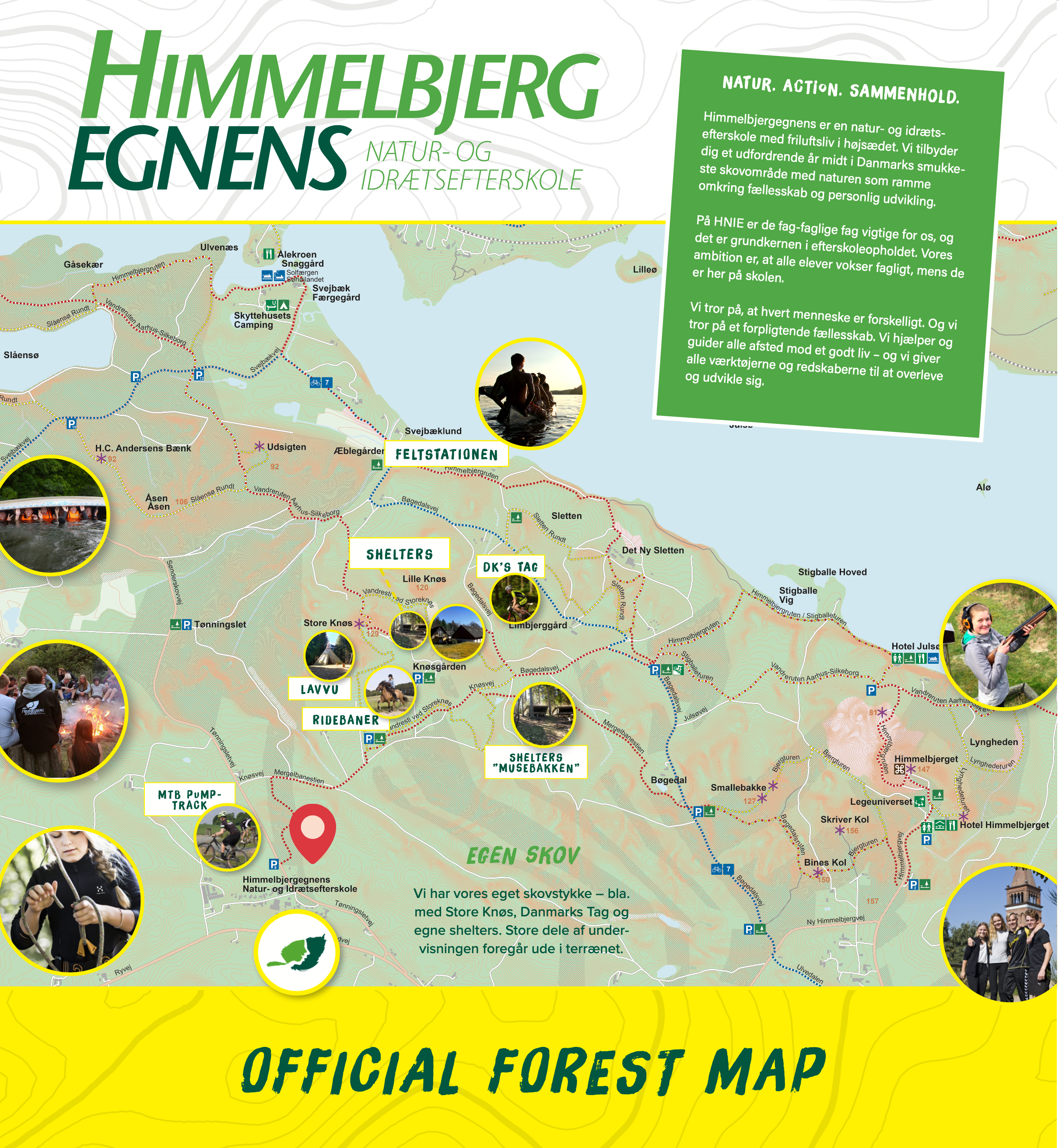 Skolens unikke skovområde og faciliteter er skiltet således, at selve skolen indgår som en del af brandingen.